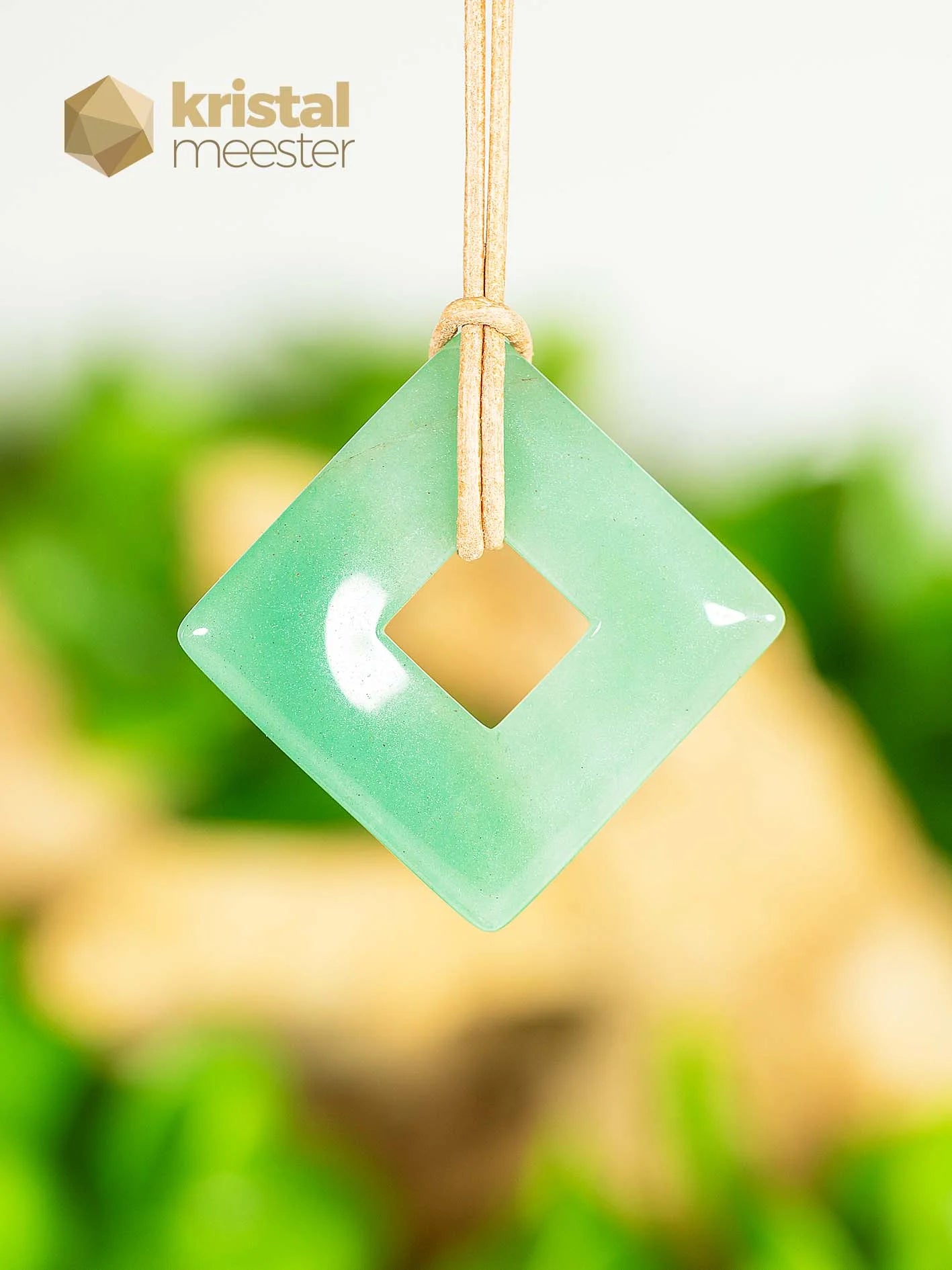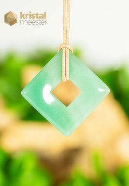 Mooie Groene Aventurijn donut, vierkant- 35 mm. Groene Aventurijn werkt sterk op het Hartchakra en heeft een positieve werking op het hart en de bloeddruk. Heeft een fijne kalmerende werking en brengt het hoofd tot rust. Lees meer