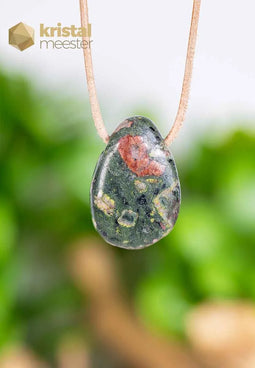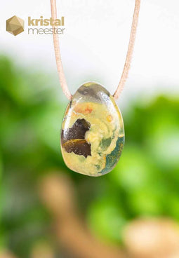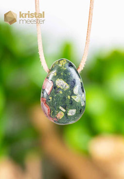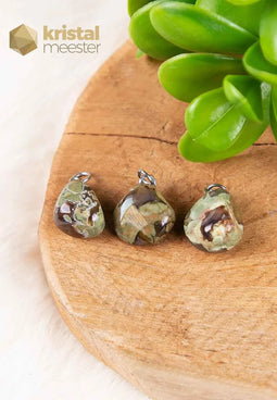 Mooie Rhyoliet hanger. Rhyoliet is een aardende steen en ondersteunt in turbulente tijden. Het is een steen die je in het hier en nu plaatst en uitnodigt om de juiste stappen te zetten in het leven. Geeft zelfvertrouwen en versterkt het immuunsysteem. Lees meer