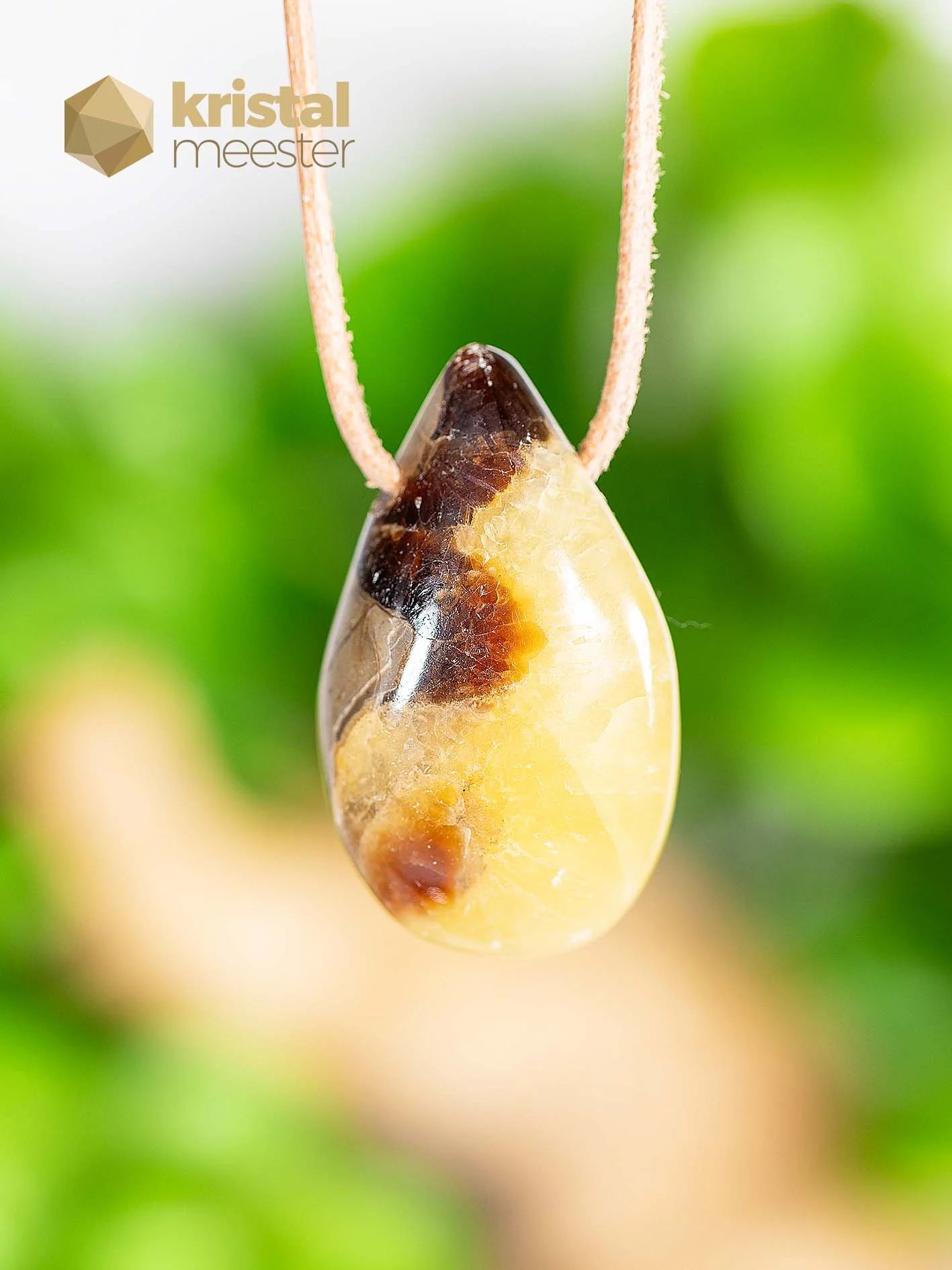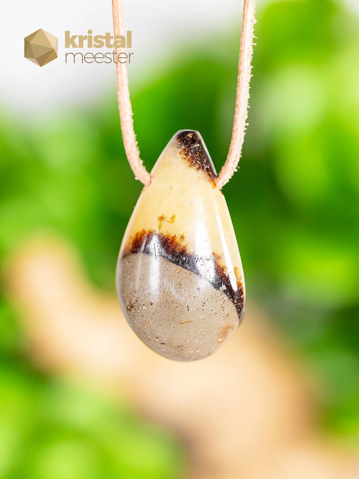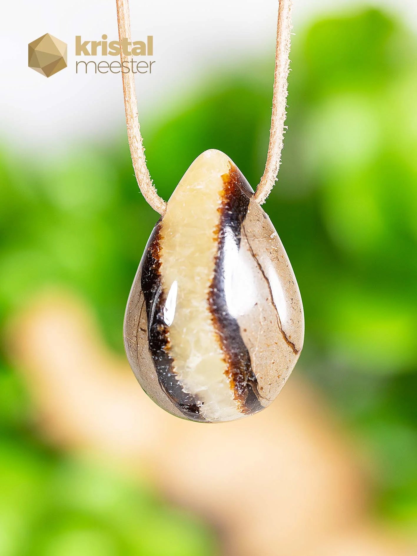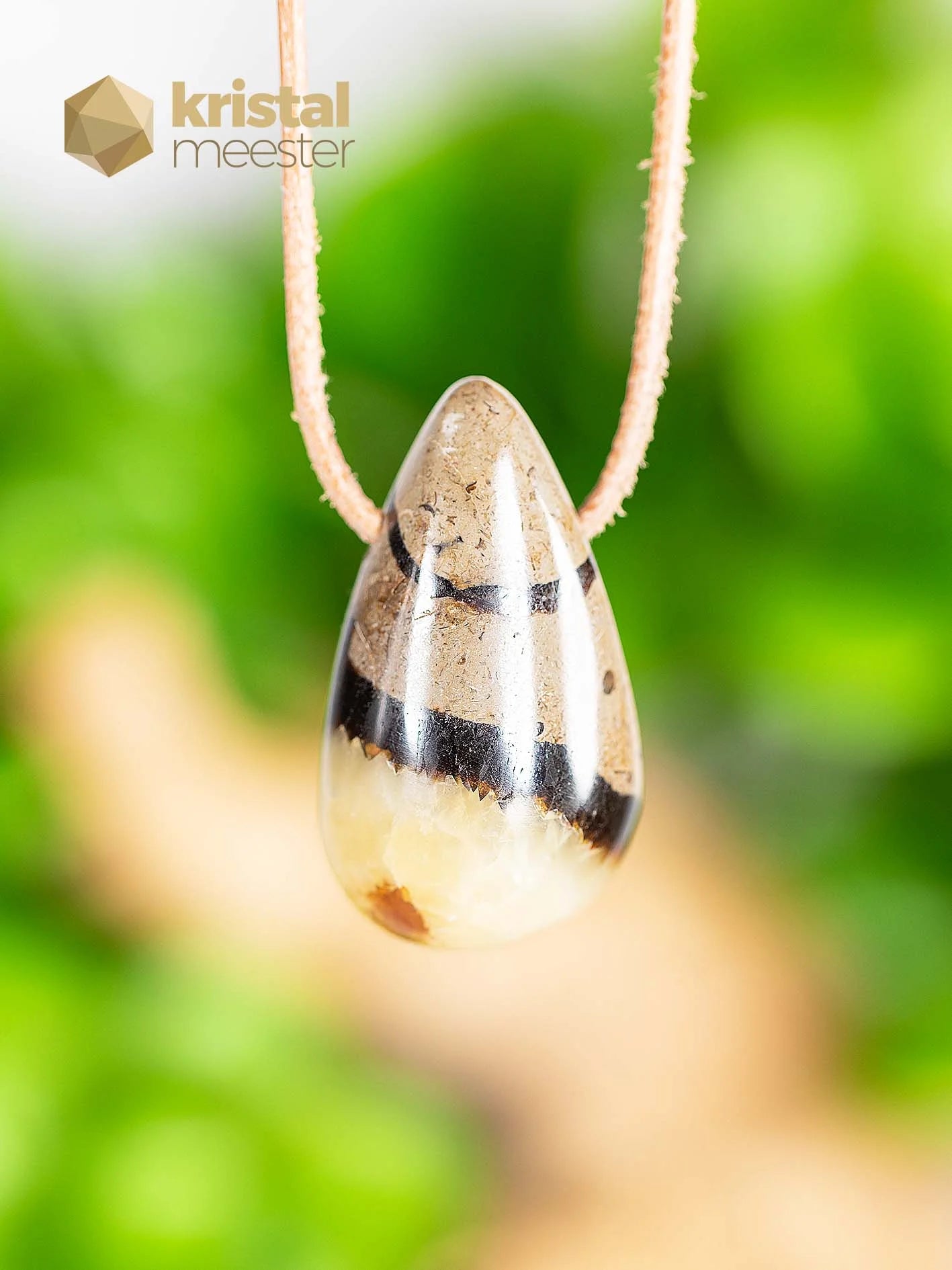 Prachtige Septarie druppelhanger. Septarie is een aardende, zuiverende en kalmerende steen die het zelfgenezend vermogen van het lichaam stimuleert en helpt om je gevoel te openen en daarop te vertrouwen. Lees meer