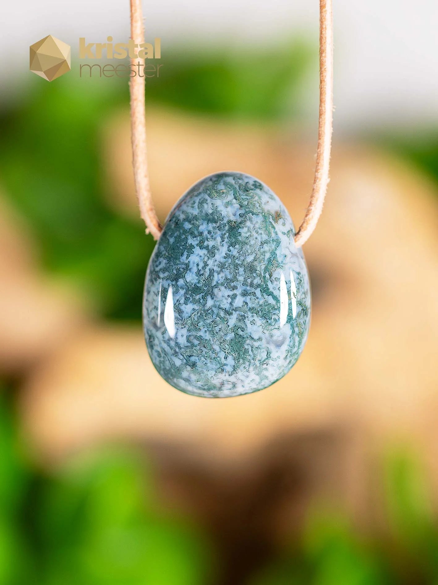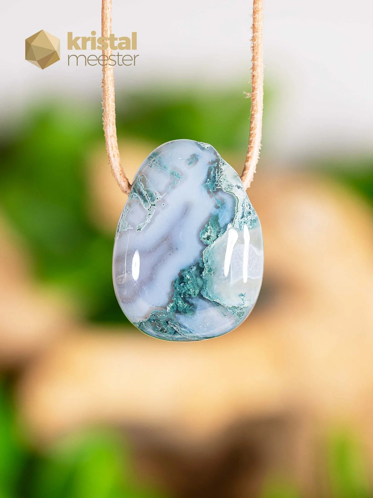 Beautiful Moss Agate EX pendant, drilled. EX stands for extra quality. Moss Agate has a fine soft energy with a gentle grounding and calming effect. Strengthens your contact with nature. Read more