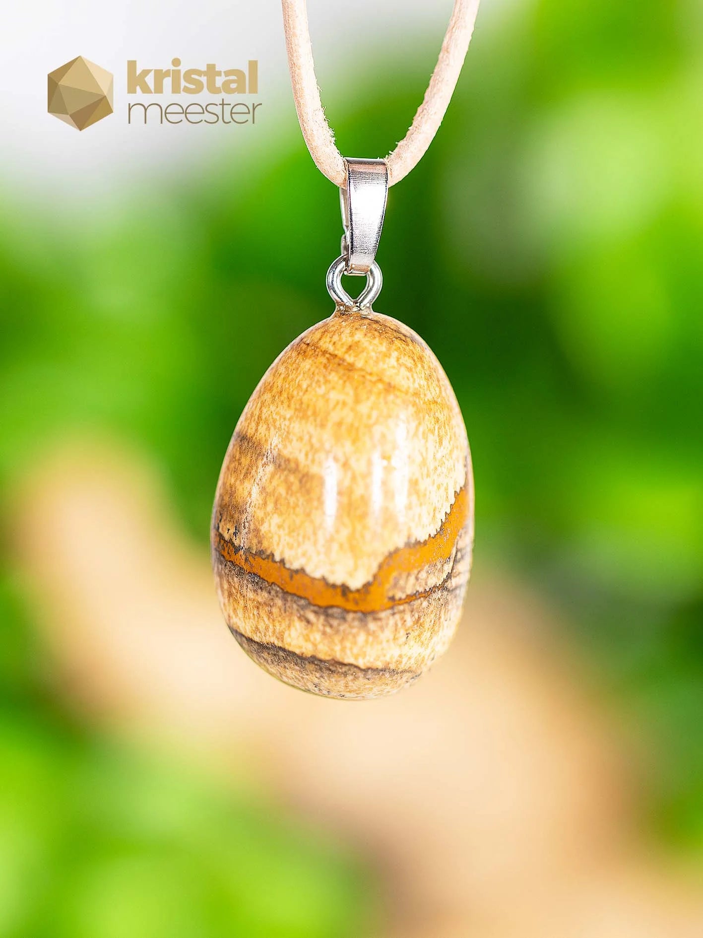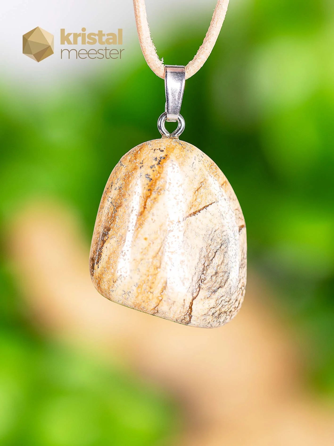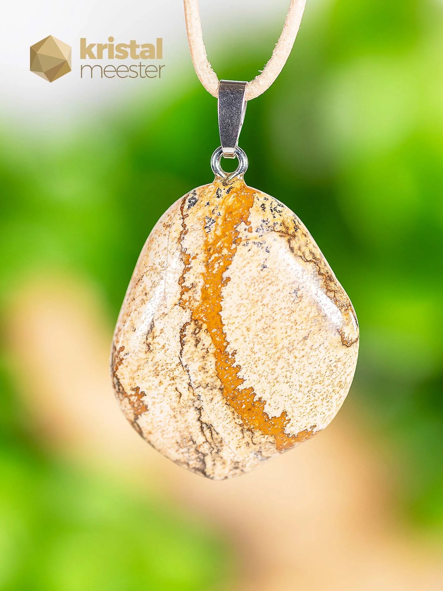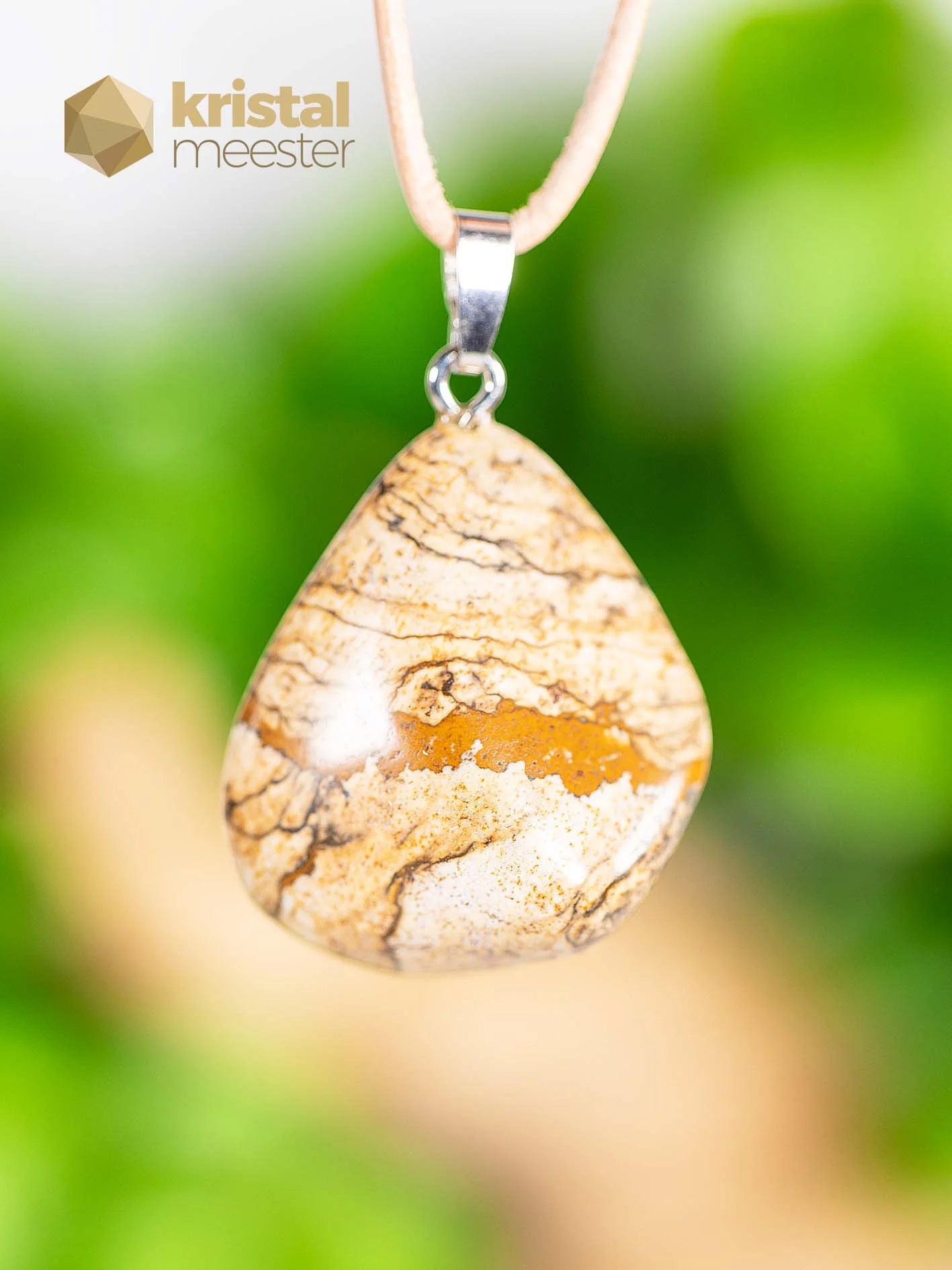 Beautiful Picture Jasper pendant with silver loop. Picture Jasper is a grounding and protective stone that helps you stay rooted and connected to the earth. It inspires action towards achieving your goals.Read more