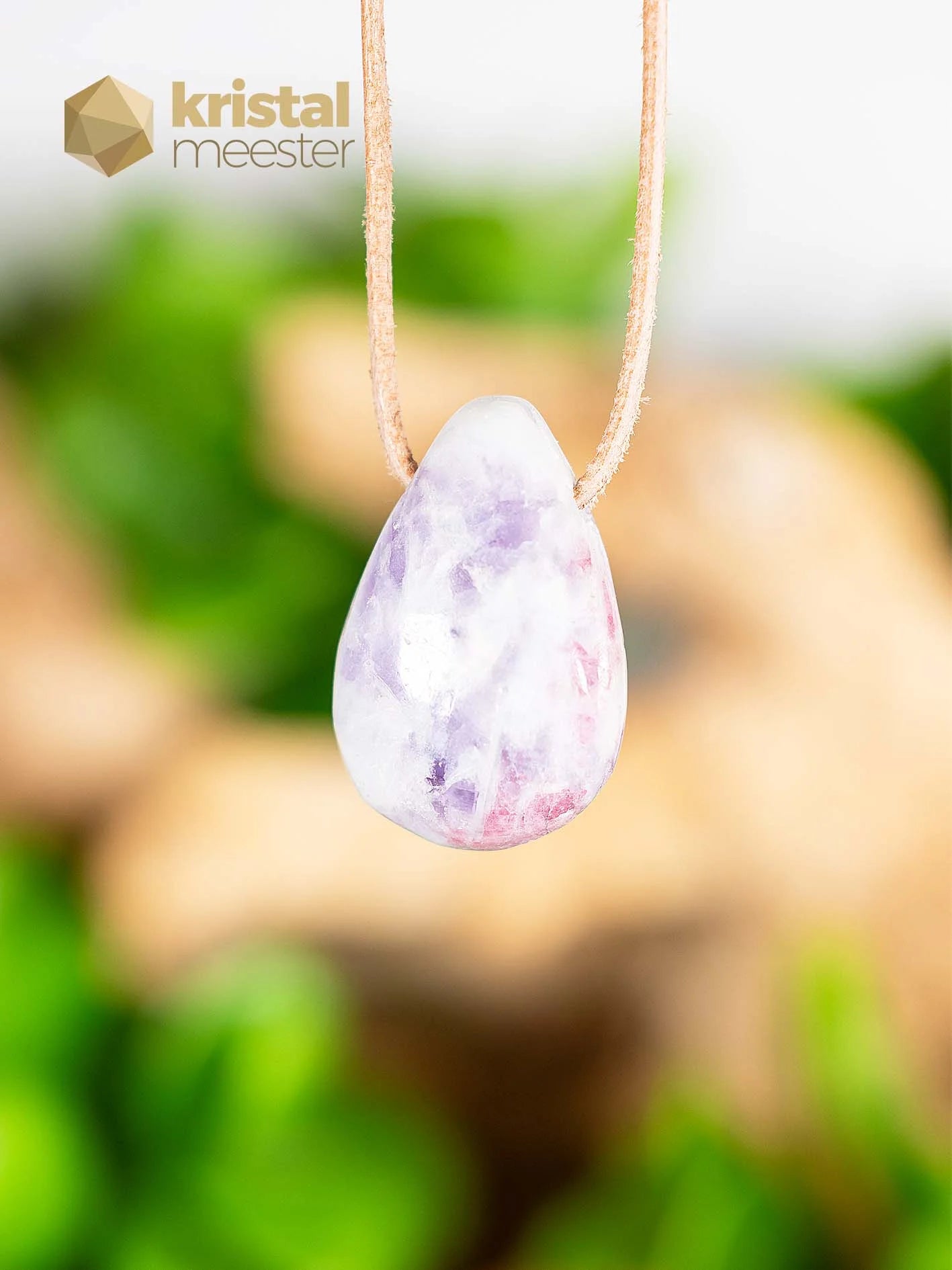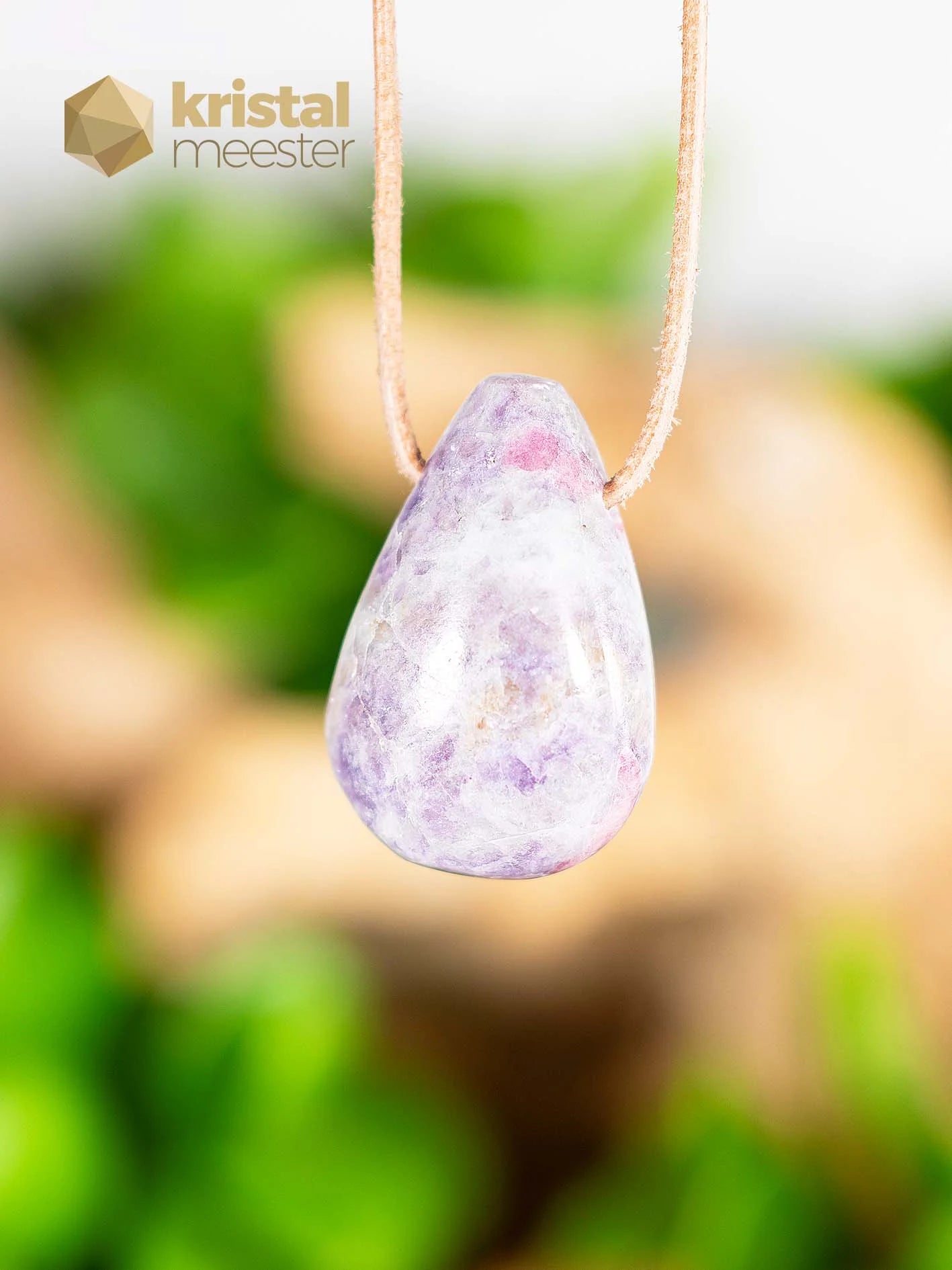 Beautiful Pink Tourmaline and Lepidolite in Pegmatite drop shaped pendant. A lovely relaxing and protective stone that lets you discover your spiritual talents. Brings balance between body and mind. Read more