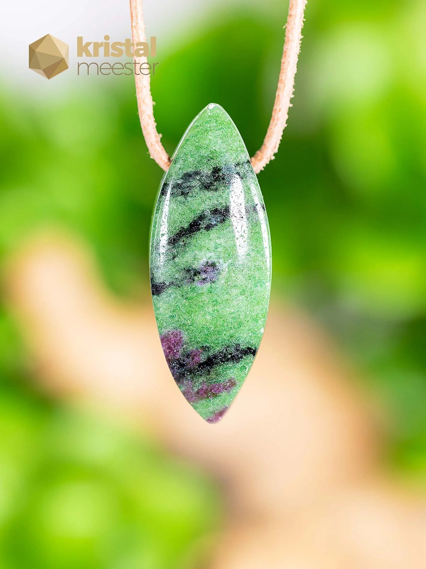 Beautiful Ruby in Zoisite pendant, oval. Ruby provides passion and life force. Zoisite energizes and supports you in growth as a person and spiritually. This combination stone helps you awaken to who you really are. Read more