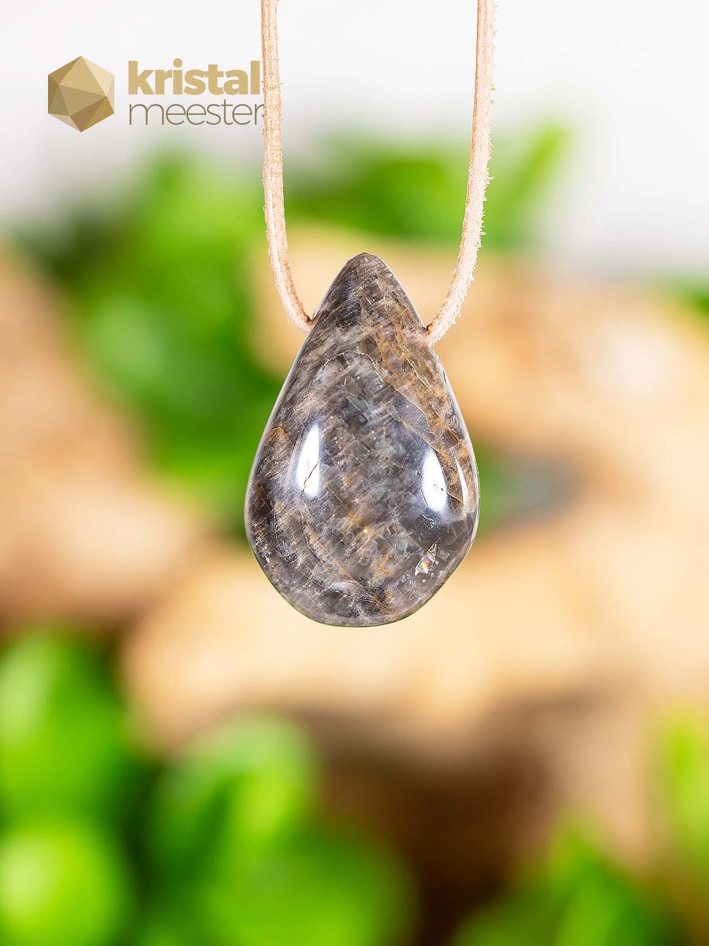 Beautiful Black Moonstone drop shaped pendant. Black Moonstone has a strong connection to the moon and feminine energy. Works detoxifying and calming. Stimulates fertility. Helps with insomnia. Read more