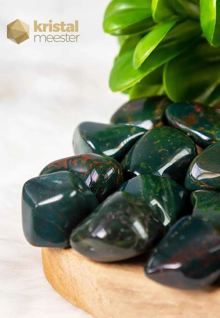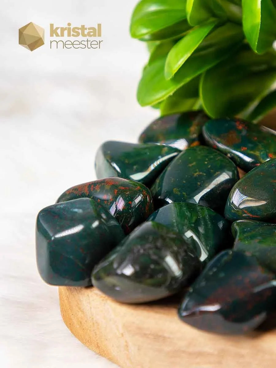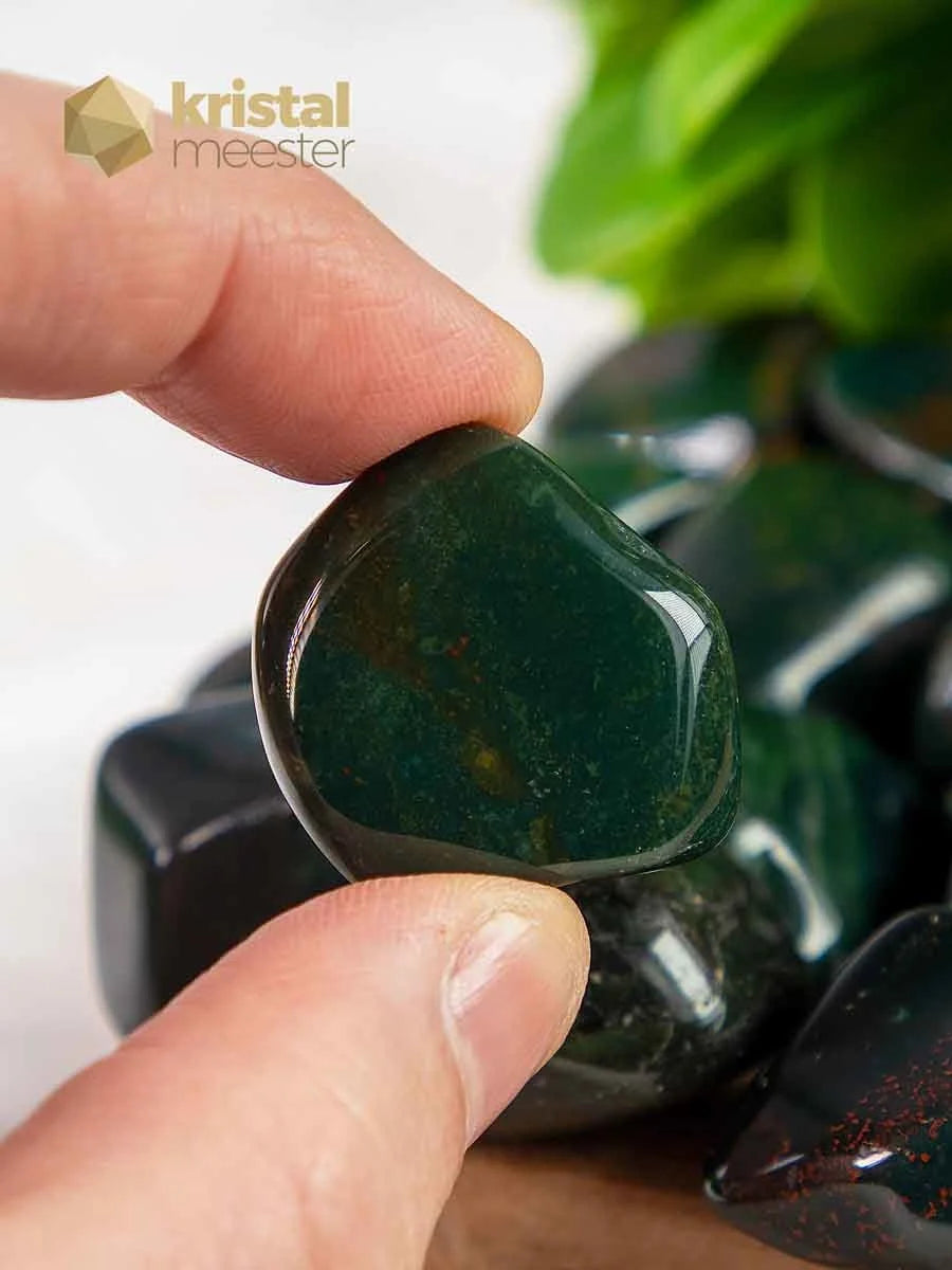 Mooie diepgroene Heliotroop trommelstenen, maat M. Heliotroop is een fijne beschermende en aardende steen. Ondersteunt bij extreme vermoeidheid of wanneer je uitgeput bent. Heeft een kalmerende werking en leert je je grenzen aan te geven.