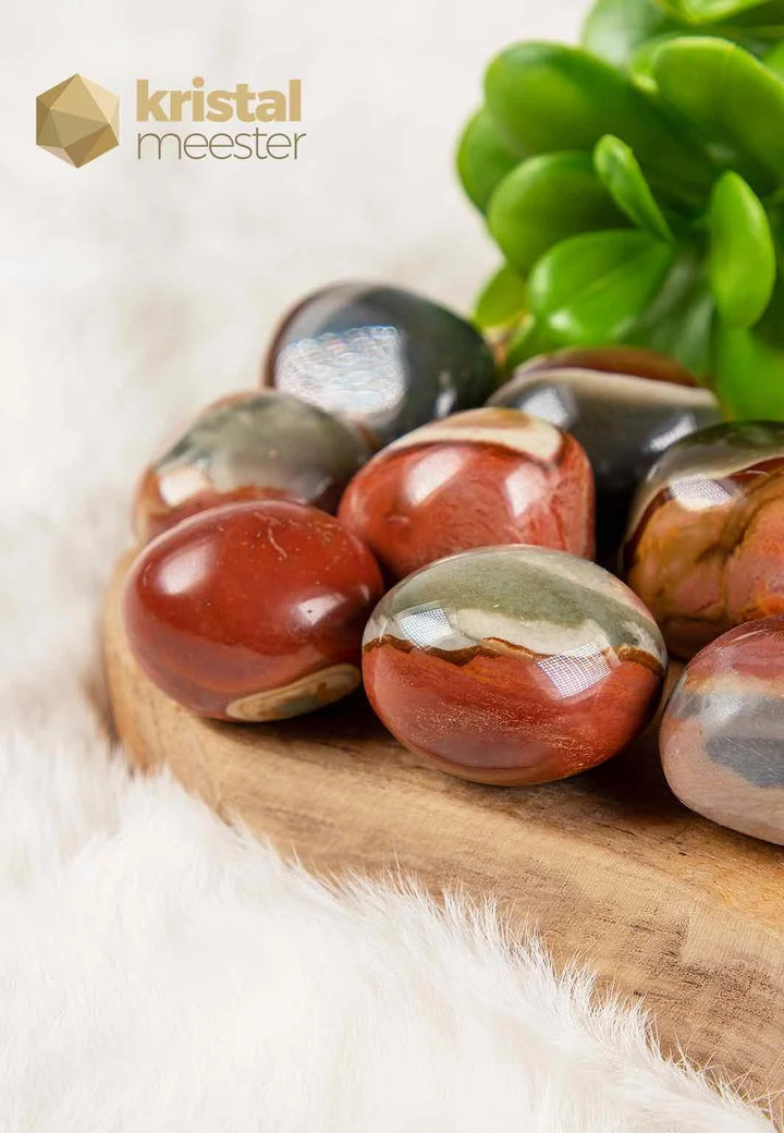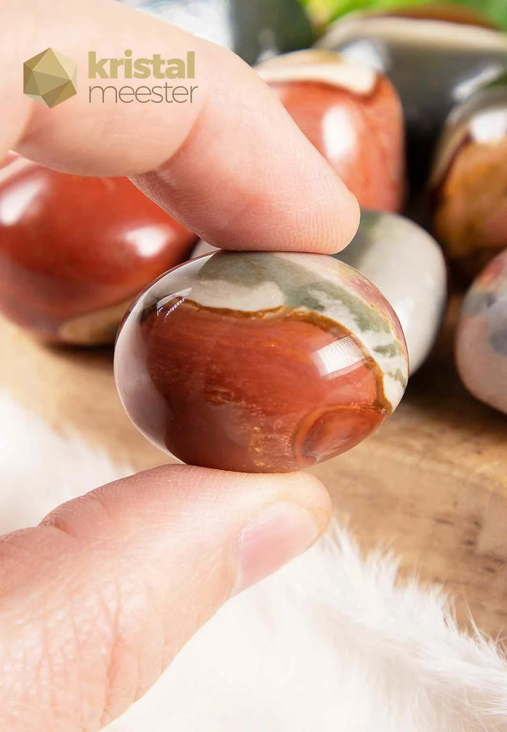 Prachtige Polychroom Jaspis trommelstenen uit Madagaskar. Polychroom Jaspis creëert rust in tijden van chaos. Als je door de bomen het bos niet meer ziet. Sterk aardende steen die je terug brengt bij jezelf.