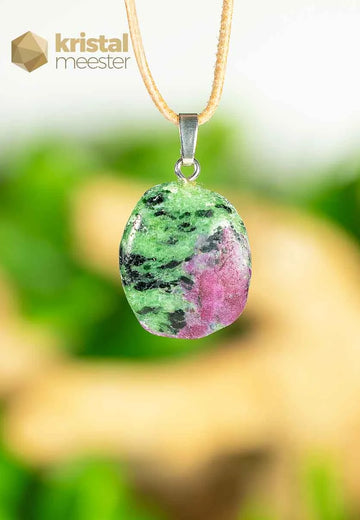 Mooie Robijn in Zoisiet hanger met zilver oog. Robijn zorgt voor hartstocht en levenskracht. Zoisiet geeft energie en ondersteunt je in groei als mens en spiritueel. Deze combinatiesteen helpt je met het ontwaken van wie je werkelijk bent.
