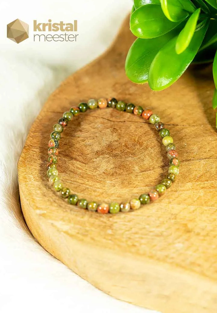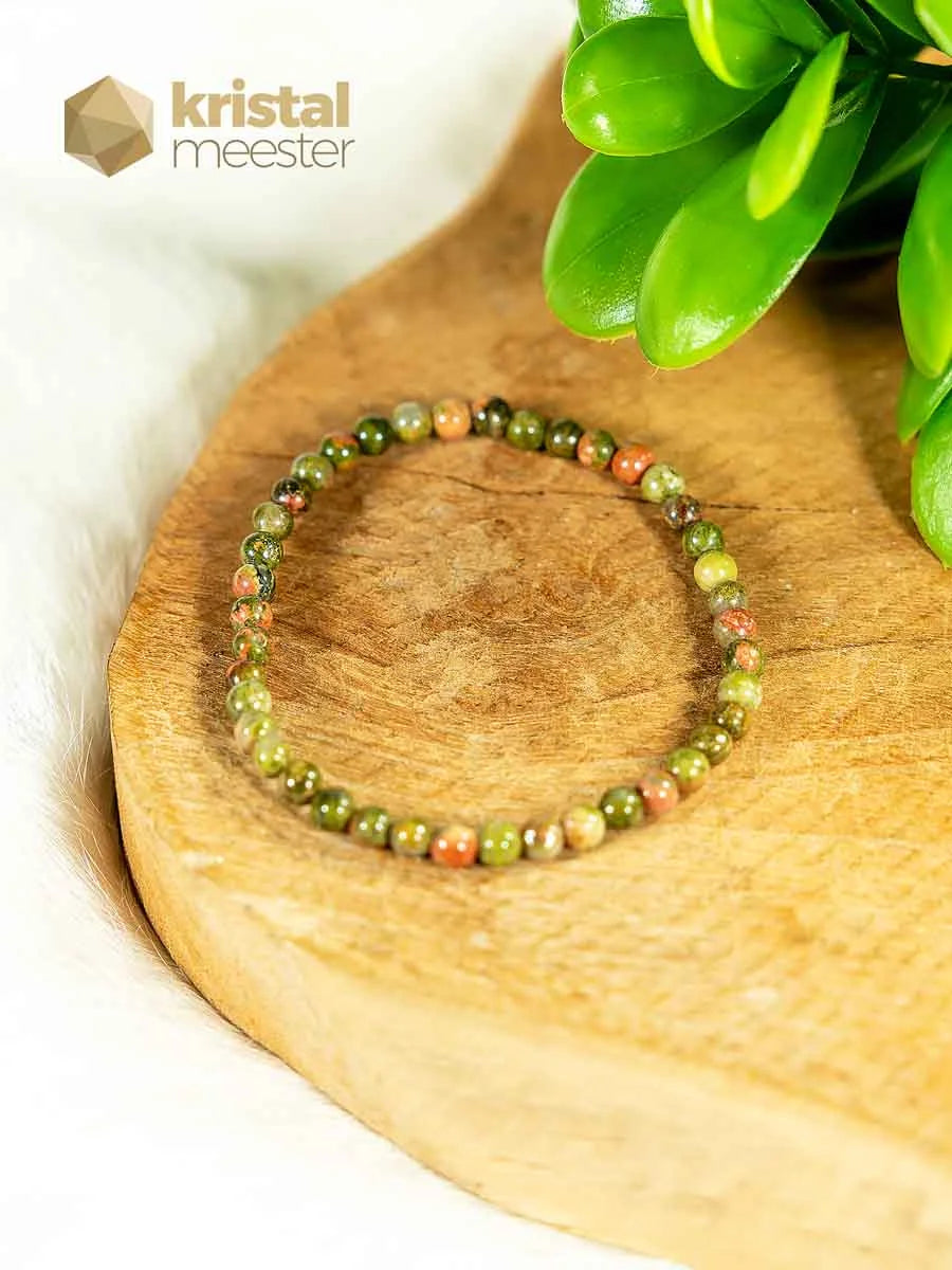 Mooie Unakiet Kogelarmband met een doorsnede van 3-4mm. Een aardende steen die de geest sterkt en de oorzaak van problemen inzichtelijk maakt waardoor je gedrag- en denkpatronen kunt doorbreken. Helpt loslaten wat je nog niet durft los te laten.